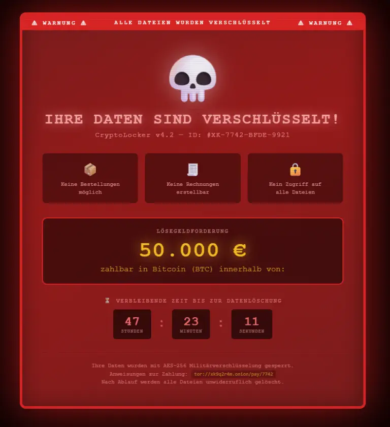 Alle IT-Systeme verschlüsselt. Lösegeldforderung in Bitcoin.